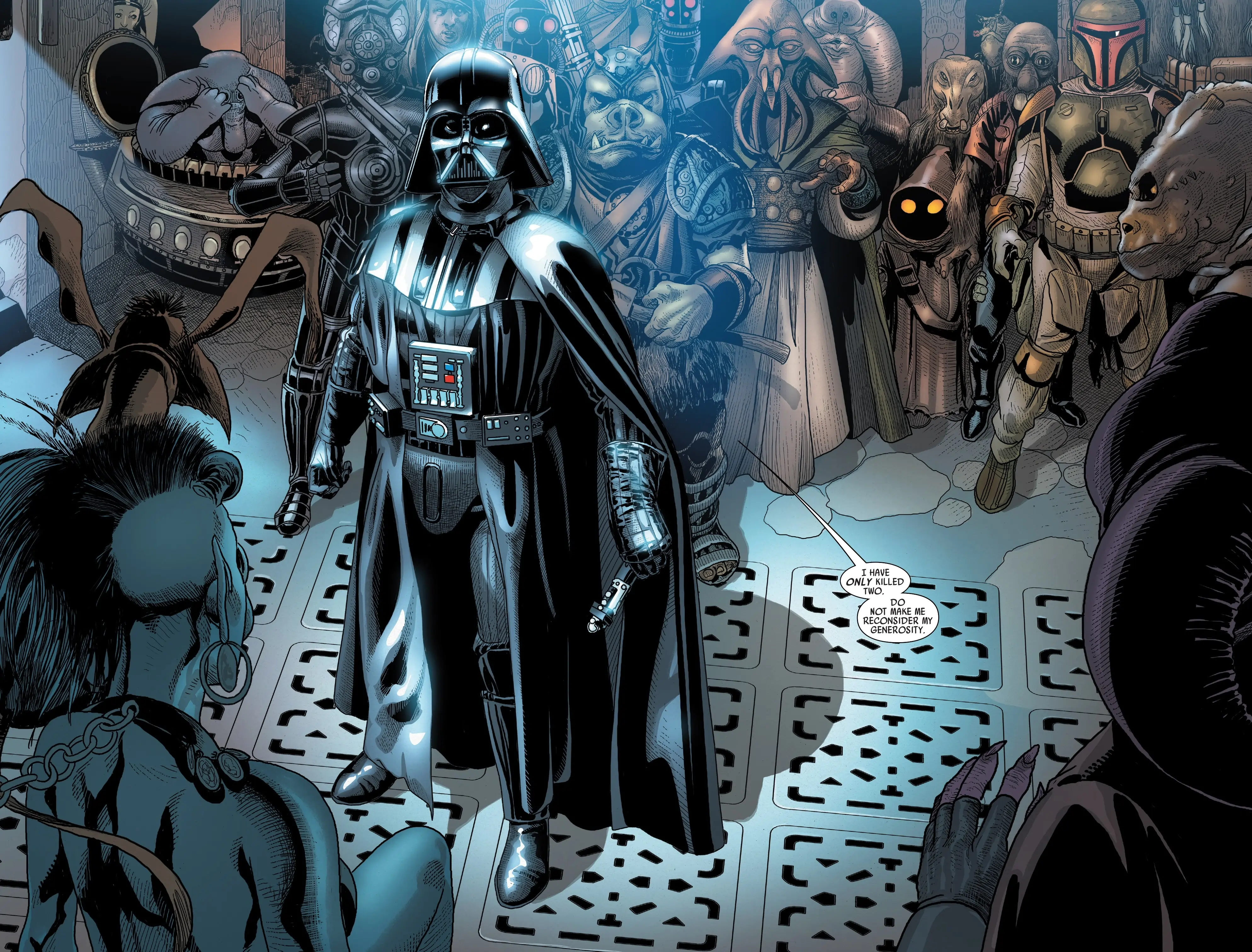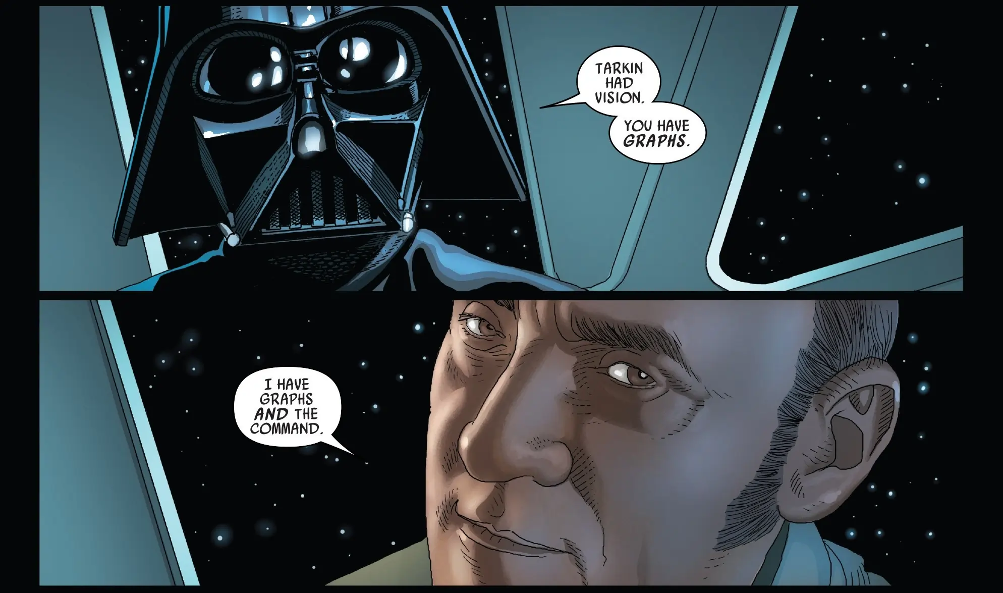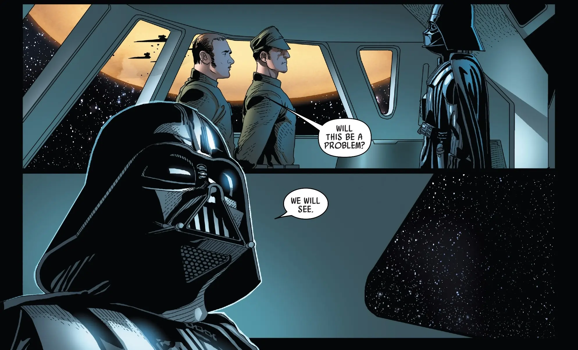 Given the titular character, readers may not be surprised to find the series set in the direct aftermath of the events of A New Hope. Vader starts on the back foot, still reeling from the encounter with Ben Kenobi and the subsequent destruction of the Death Star. The comic frames the Sith Lord as a top executive or bureaucrat who just dropped the ball on a load-bearing project. There is no obfuscation about the fact that the project was a planet-destroying superweapon, but the comic emphasizes the direct effects the failure had on Vader at both a personal and professional level, creating a darkly humorous tone. The idea of a successful black comedy at the forefront of a family-friendly Disney franchise, which is also worth its pages, is a hard line to walk, but the comic does everything it can to strike such a balance.