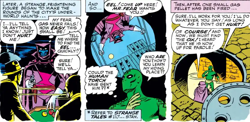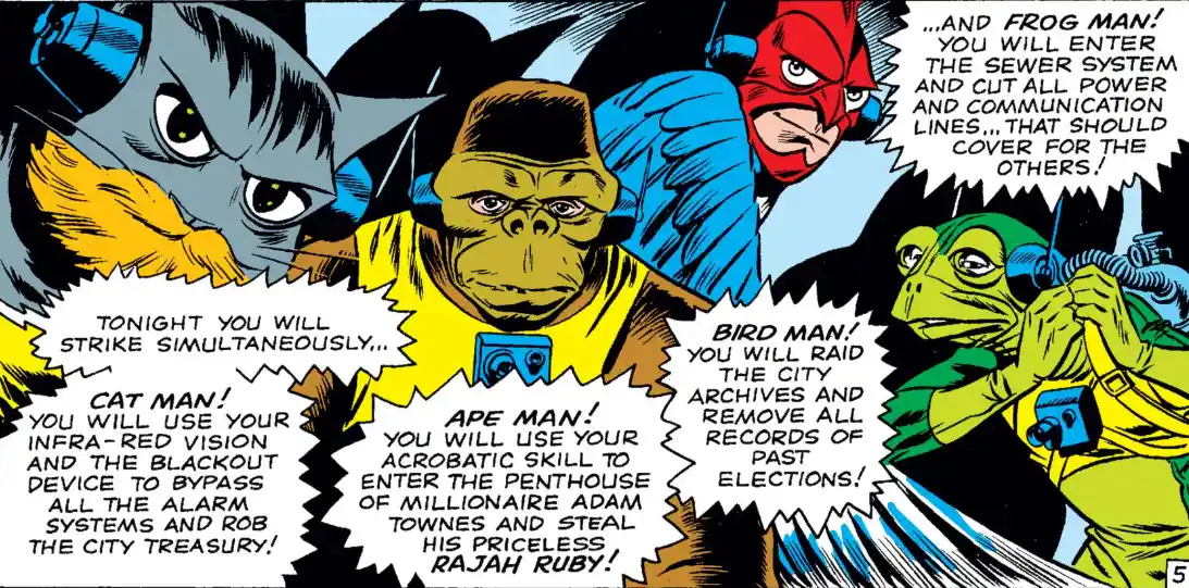 The tenth issue is a bit of a breath of fresh air, being distinct in style from the surrounding bunch. While clearly intentionally keeping with Lee’s signature tone, the plot of the issue is more complex to start. The story involves a group of villains, The Ani-Men, who should feel generic with names like Frog-Man and Ape-Man, but they each have a lot of charm. There is a more clear arc, and the writing feels more purposeful than the previous stories, which were more concerned with explaining the page rather than advancing the plot. There is a case to be made that the issue benefits from the singular writer/artist, as opposed to the usual tag team approach. The entire story is a setup to a mystery that will be concluded in the next one, while claiming that all the hints the readers need are there if they can find it. Even a small gimmick like that feels innovative given the context.