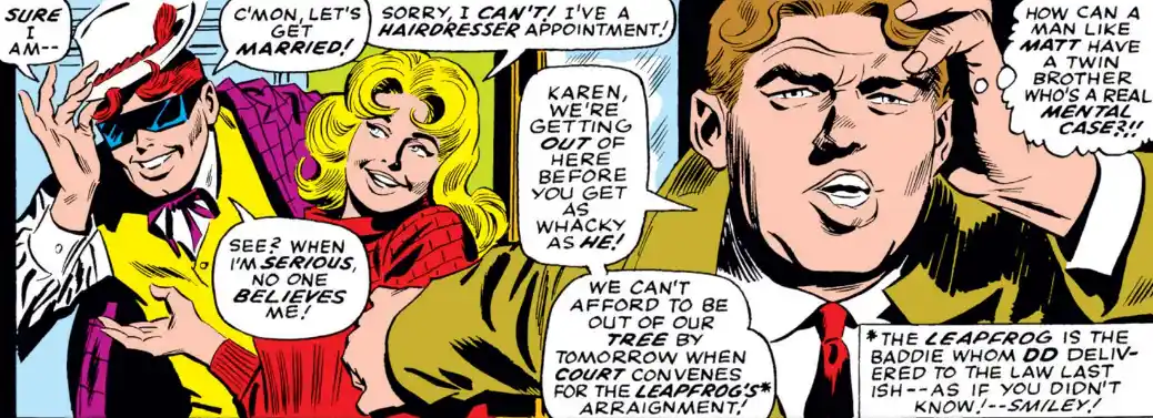The best example from this batch of stories is when Daredevil faces the Jester. Much like the other recent arcs, the formula is a weird and specifically themed villain has shown up to fight Daredevil and be defeated over three or four issues. The Jester is actually one of the longer arcs and the story is a pure slog when revisited today when clown villains are among the most played out tropes in the medium.